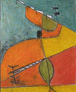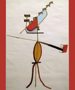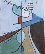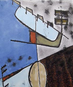 On my second morning at Il Collegio, while having breakfast in The Doctor's House/Castle where I was staying, I noticed the TV aerials on the rooftops. I found them charming and humorous. They reminded me of music stands. So I spent the day doing a series of drawings of my rather unusual subject, using fibre tip pens and pencil as my medium. In the days that followed, I did a number of variations on one of my designs (aerial right): in monoprint (with fibre tip pens and pastel) and acrylic.